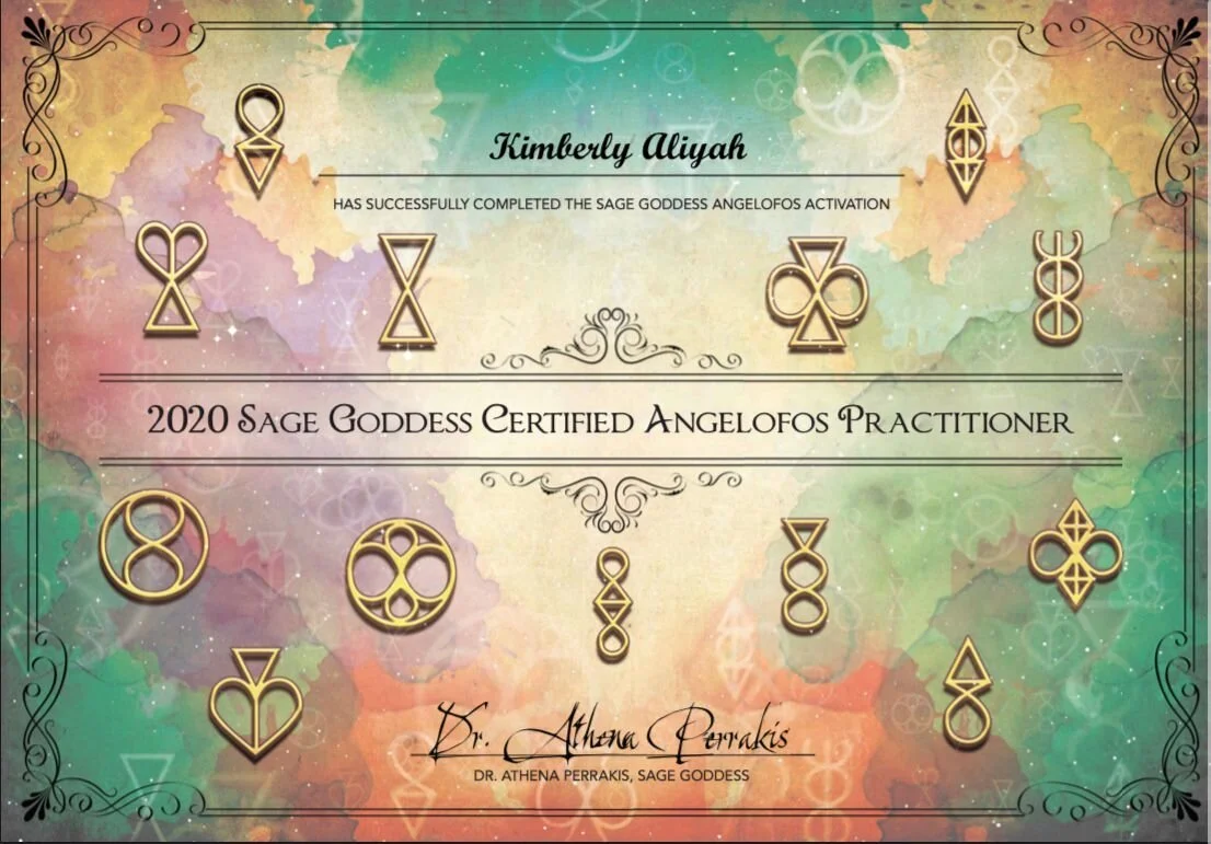 Initiated Priestess, Certified Crystal Healer, Certified Angelofos Practitioner, spiritual leadership/coaching, holistic shamanism, pagan traditions, magic, tarot, and astrology, 2017-2020, with Athena Perrakis, Ph.D., Sage Goddess